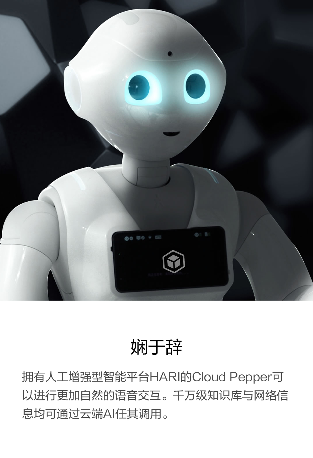 拥有人工增强型智能平台HARIX的Cloud Pepper可以进行更加自然的语音交互。千万级知识库与网络信息均可通过云端AI任其调用。